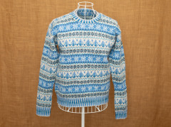 水色のセーターは、ご好評をいただいています。編み物の本に「16歳のお祝いに祖母から贈られたセーター」と紹介されていた白と水色の編み込み模様のセーターをヒントに工夫したものです。