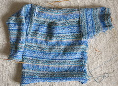 編み始めてから3週間近くになるセーターです。身頃は前後つなげた輪にして、裾から編み始めます。袖ぐりも襟ぐりもスティークスにして肩まで編んでいます。